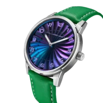 Jedes Zifferblatt wird einzeln mit Chamäleonpigmenten veredelt, die dynamische Farbverläufe entlang der geschwungenen Blätter erzeugen
