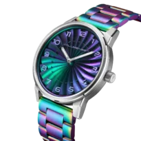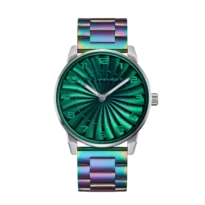 Jedes Zifferblatt wird einzeln mit Chamäleonpigmenten veredelt, die dynamische Farbverläufe entlang der geschwungenen Blätter erzeugen