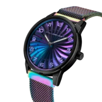 Jedes Zifferblatt wird einzeln mit Chamäleonpigmenten veredelt, die dynamische Farbverläufe entlang der geschwungenen Blätter erzeugen