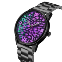 Jedes Zifferblatt wird von Hand mit Chamäleonpigmenten veredelt und zeigt dynamische Farbübergänge, die an Skylines aus der Vogelperspektive erinnern