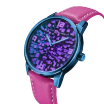 Jedes Zifferblatt wird von Hand mit Chamäleonpigmenten veredelt und zeigt dynamische Farbübergänge, die an Skylines aus der Vogelperspektive erinnern