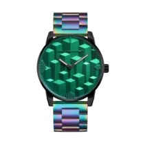 Die Chamäleon-Beschichtung des Zifferblatts reagiert intensiv auf Licht und verändert die Farbe je nach Perspektive.