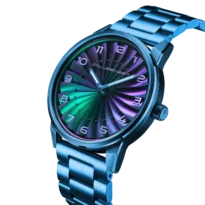 Each dial is hand-finished with chameleon pigments, creating luminous color shifts across the curved blades