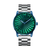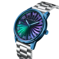 Each dial is hand-finished with chameleon pigments, creating luminous color shifts across the curved blades