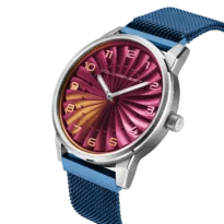 Each dial is hand-finished with chameleon pigments, creating luminous color shifts across the curved blades
