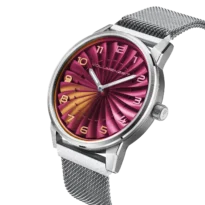 Each dial is hand-finished with chameleon pigments, creating luminous color shifts across the curved blades