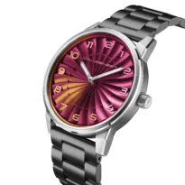 Each dial is hand-finished with chameleon pigments, creating luminous color shifts across the curved blades