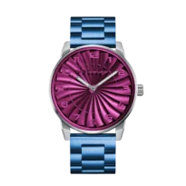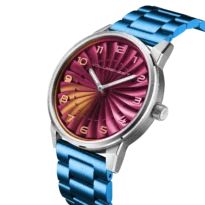 Each dial is hand-finished with chameleon pigments, creating luminous color shifts across the curved blades