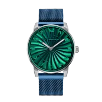 Each dial is hand-finished with chameleon pigments, creating luminous color shifts across the curved blades