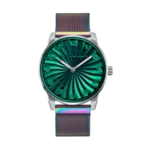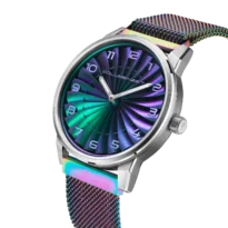 Each dial is hand-finished with chameleon pigments, creating luminous color shifts across the curved blades