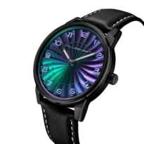 Each dial is hand-finished with chameleon pigments, creating luminous color shifts across the curved blades