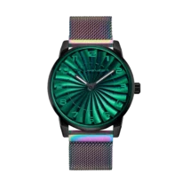Each dial is hand-finished with chameleon pigments, creating luminous color shifts across the curved blades