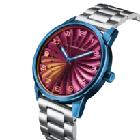 Each dial is hand-finished with chameleon pigments, creating luminous color shifts across the curved blades