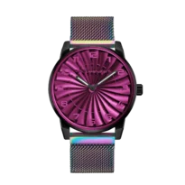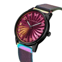 Each dial is hand-finished with chameleon pigments, creating luminous color shifts across the curved blades