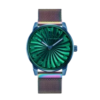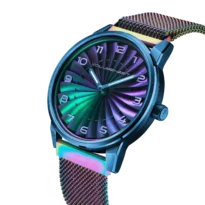 Each dial is hand-finished with chameleon pigments, creating luminous color shifts across the curved blades