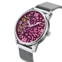This dial captures the perspective of a city seen from above — a structured maze of rooftops, light, and motion.