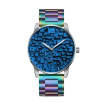 Every dial is hand-painted using chameleon pigments, creating shifting tones reminiscent of skylines viewed from above