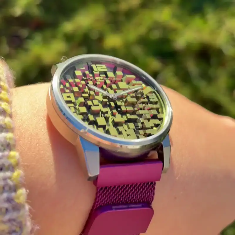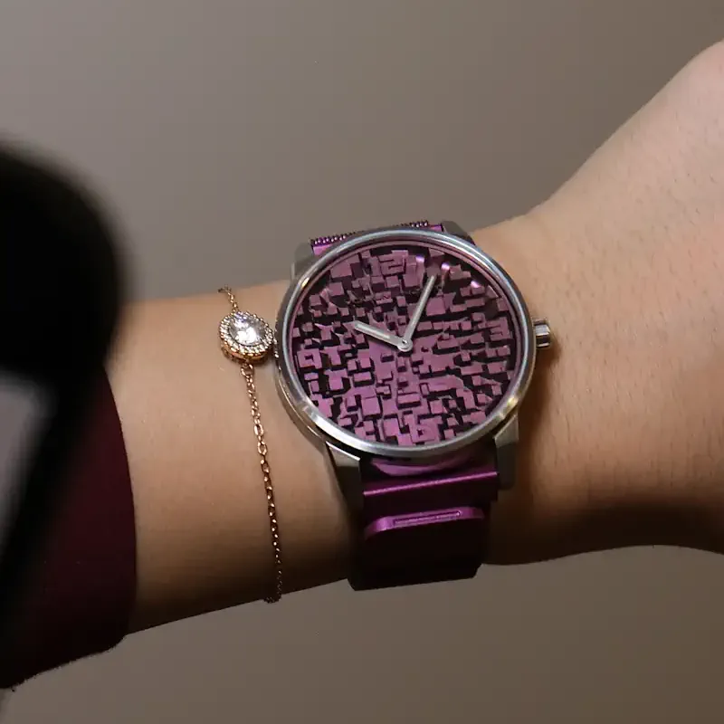 This dial captures the perspective of a city seen from above — a structured maze of rooftops, light, and motion.