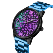 Every dial is hand-painted using chameleon pigments, creating shifting tones reminiscent of skylines viewed from above