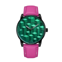 Each dial is individually hand-painted with color-shifting pigments, creating a unique optical effect on every watch