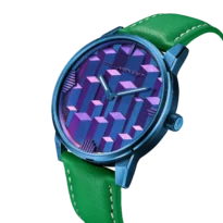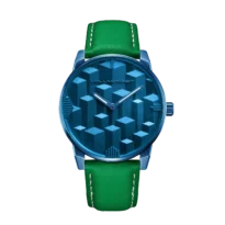 Each dial is individually hand-painted with color-shifting pigments, creating a unique optical effect on every watch